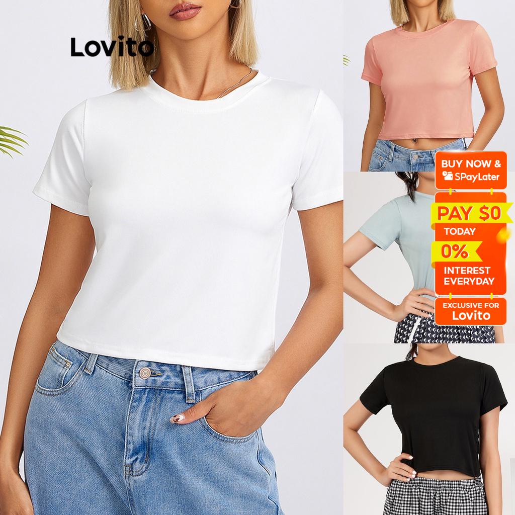 Lovito Casual Plain Crew Neck Basic Tshirt for Woman L18X101 (White/Pink/Blue/Black)